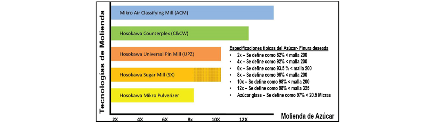 En la industria azucarera, las definiciones utilizadas anteriormente con respecto a una molienda "X" definida por un porcentaje de material por debajo de un cierto tamaño de malla, varían de un fabricante a otro. Como tal, Hosokawa ha desarrollado un estándar definido para cada uno de los molinos como se muestra en el cuadro a continuación.
