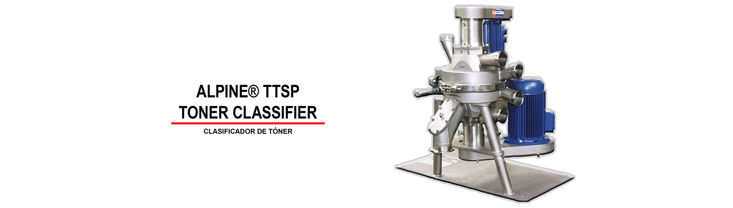 El clasificador de tóner Alpine® TTSP fue desarrollado especialmente para el desempolvado de tóner. Protegido por patentes adicionales, el clasificador de tóner Alpine® TTSP es un refinamiento del clasificador de tóner TSP, principalmente con el objetivo de mejorar aún más la precisión de corte por medio de dos etapas de clasificación consecutivas. Con la misma carga de producto del aire de clasificación, el clasificador de tóner en tándem logra una precisión de corte mucho más alta que el TSP, o con una calidad de producto basto constante, logra un factor de carga más alto. Esto hace posible casi triplicar el rendimiento en comparación con el TSP. Debido al peligro de explosión de polvo asociado con el procesamiento del tóner, los clasificadores están diseñados para ser a prueba de explosiones y golpes de presión hasta una sobrepresión de 10 bar.