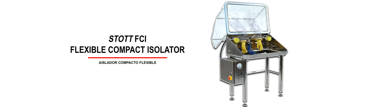 Aislador compacto flexible Stott-FCI (Flexible Compact Isolator). Una solución de contención barrera, modular y económica, que se puede transportar fácilmente a donde se necesitan niveles de contención <1 μg / m3.